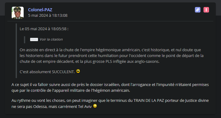 Ca me ferait très plaisir, mais il faut être réaliste, la Russie n'y a aucun intérêt, et le fruit occidental basé sur l'ordre international post 1945 est tellement pourri qu'ils n'ont qu'à attendre qu'il tombe de lui-même, croulant sous la dette et les crises institutionnelles, notre sort ne les intéresse absolument pas. L'occident est à peu près au même stade que l'URSS au début des années 80.