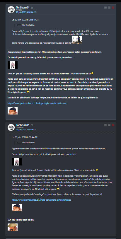 Par ailleurs, je ne suis pas le monsieur que tu cites ici, mes pseudos sont toujours volontairement bien identifiables pour que vous ne puissiez pas vous tromper. TonSeumXx ou general/colonel/amiralPAZ.