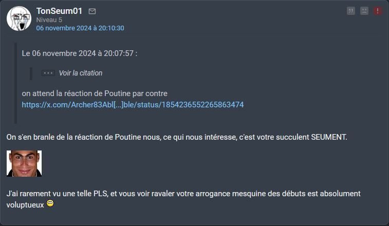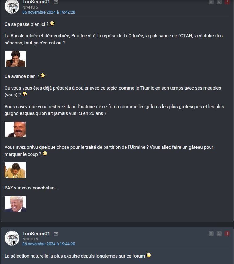 Petite mention au MP envoyé "A la niche, l'Ukraine est finito" juste après la victoire de Trump en novembre. Toujours un régal de le lire![]()