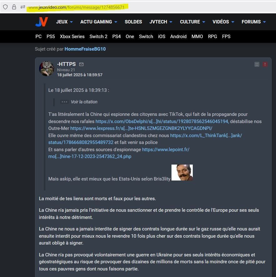 > > > > > > > > > T'as littéralement la Chine qui espionne des citoyens avec TikTok, qui fait de la propagande pour descendre nos rafales https://x.com/ObsDelphi/status/1928078562546045194, déstabilise nos Outre-Mer https://www.lexpress.fr/societe/comment-russie-et-chine-destabilisent-la-france-en-outre-mer-au-coeur-de-lenquete-HSNL5ZMGEZGNBK2YLYYCAGDNPI/