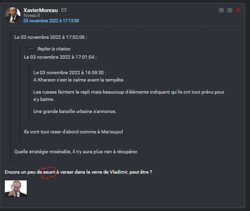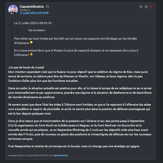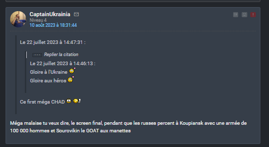Et je les maintiens tous. Au moment où je les écrivais la guerre était deja perdue pour quiconque avait un peu de jugeote, il n'y a que sur ce forum que des génies continuent de forcer après l'échec cuisant (et absolument ridicule) de la fameuse contre-offensive avec laquelle vous nous avez beurré la raie pendant des mois.