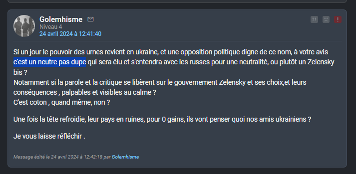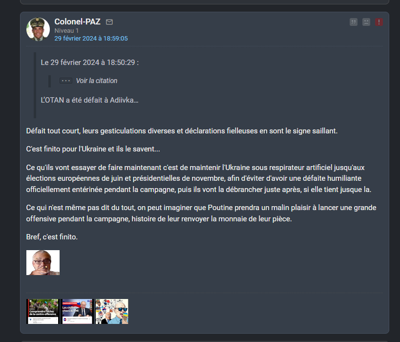 Par ailleurs mes "prédictions", ne sont rien d'autre que la défaite de l'Ukraine/OTAN, la chute de l'empire hégémonique américain, l'essor des BRICS, l'échec de la contre-offensive de 2023, la prise de Bakhmout puis d'Avdiivka.