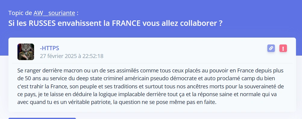 Siouplix qui se rend compte à quel point c'est un traitre anti France en faisant mine de ne pas avoir vu ma question quand je lui demande si il est américain...Parce que ta question est idiote et tu connais déjà la réponse le bot russe