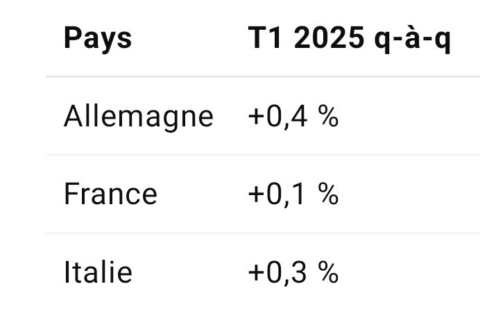 Par contre, Allemagne, France et Italie (52% du PIB et 55 % de la production industrielle de l'UE, et moteurs de l'économie européenne) ca se passe pas bien du tout en ce premier semestre 2025.