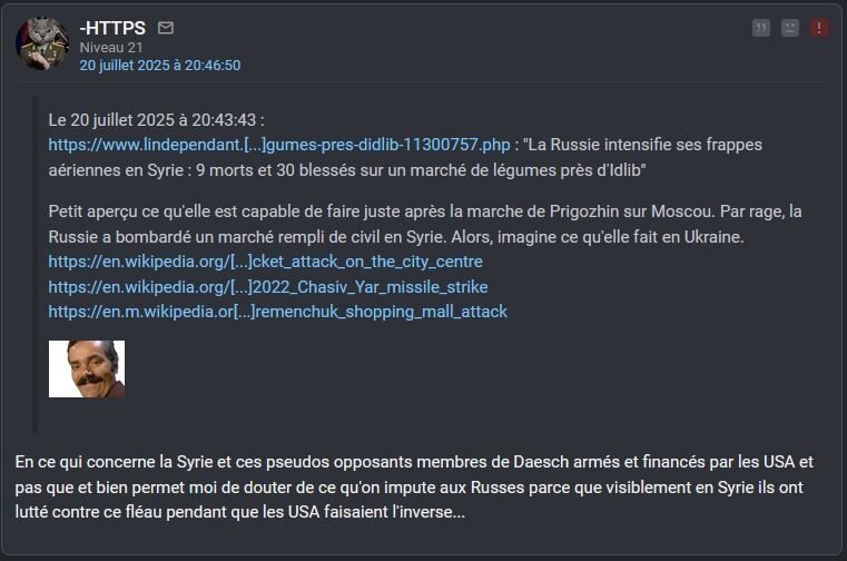 https://www.lindependant.fr/2023/06/25/la-russie-intensifie-ses-frappes-aeriennes-en-syrie-9-morts-et-30-blesses-sur-un-marche-de-legumes-pres-didlib-11300757.php : "La Russie intensifie ses frappes aériennes en Syrie : 9 morts et 30 blessés sur un marché de légumes près d'Idlib"Petit aperçu ce qu'elle est capable de faire juste après la marche de Prigozhin sur Moscou. Par rage, la Russie a bombardé un marché rempli de civil en Syrie. Alors, imagine ce qu'elle fait en Ukraine.