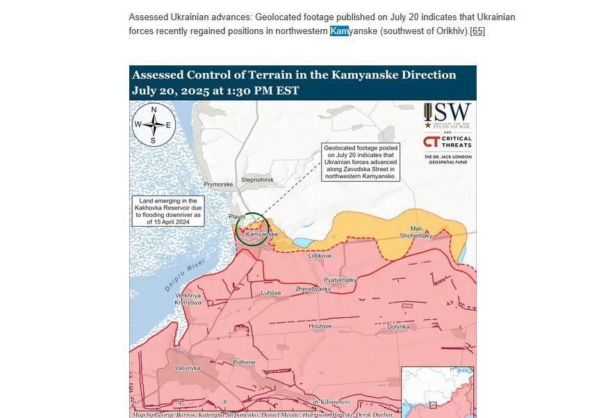 "Assessed Ukrainian advances: Geolocated footage published on July 20 indicates that Ukrainian forces recently regained positions in northwestern Kamyanske (southwest of Orikhiv).[65]"