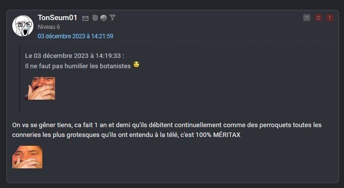 Donc, t'avoues camper le topic depuis 3 ans, mais le pseudo TonSeum est apparu ici que depuis 2 ans environs. Tu nous expliques ? Je vais pre-shot la réponse : "J'ai ghostfag le topic jusqu'à saturation de vos trésors d'ingéniosités pour me divertir tel un vin millésimé au cépage vieilli à la rage depuis 3 ans"