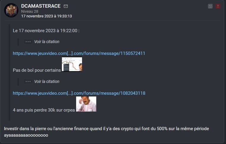 Frère, vous allez devenir une institution sur le forum, un peu comme les crypto-golems du forum finance, qui valent absolument le détour aussi.