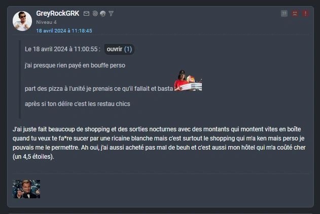> > Frère, vous allez devenir une institution sur le forum, un peu comme les crypto-golems du forum finance, qui valent absolument le détour aussi.