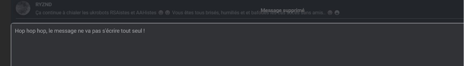 On ne perd pas ses vieilles habitudes à ce que je vois chez Bris3lity. Je suppose qu'il n'a pas assumé cette coup de poing ligne des "larmes de petit enfant qui lui procure une telle jouissance"![]()