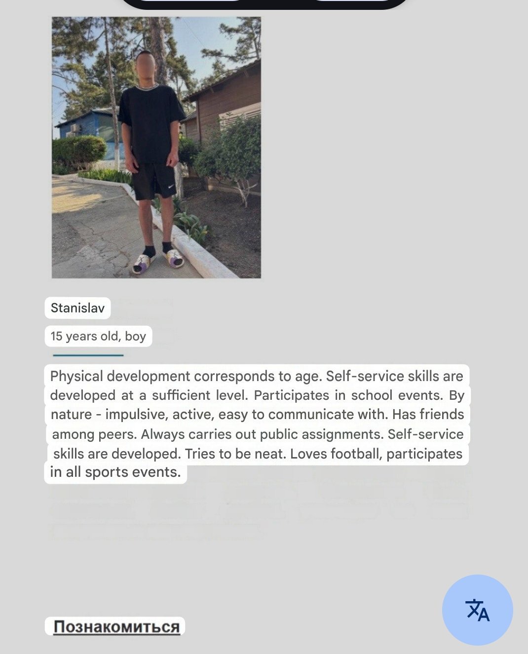"Nikita s'est révélé être un enfant actif. Lorsqu'il communique avec les autres enfants, il adopte une position de leader et ses camarades écoutent son avis. Il s'adapte facilement à n'importe quelle situation. Dans ses relations, il choisit les enfants plus âgés. Il entretient des relations amicales avec ses camarades de classe. Il maîtrise le programme scolaire à un niveau moyen. Il a acquis des compétences en matière d'autonomie. Son développement physique correspond à son âge."