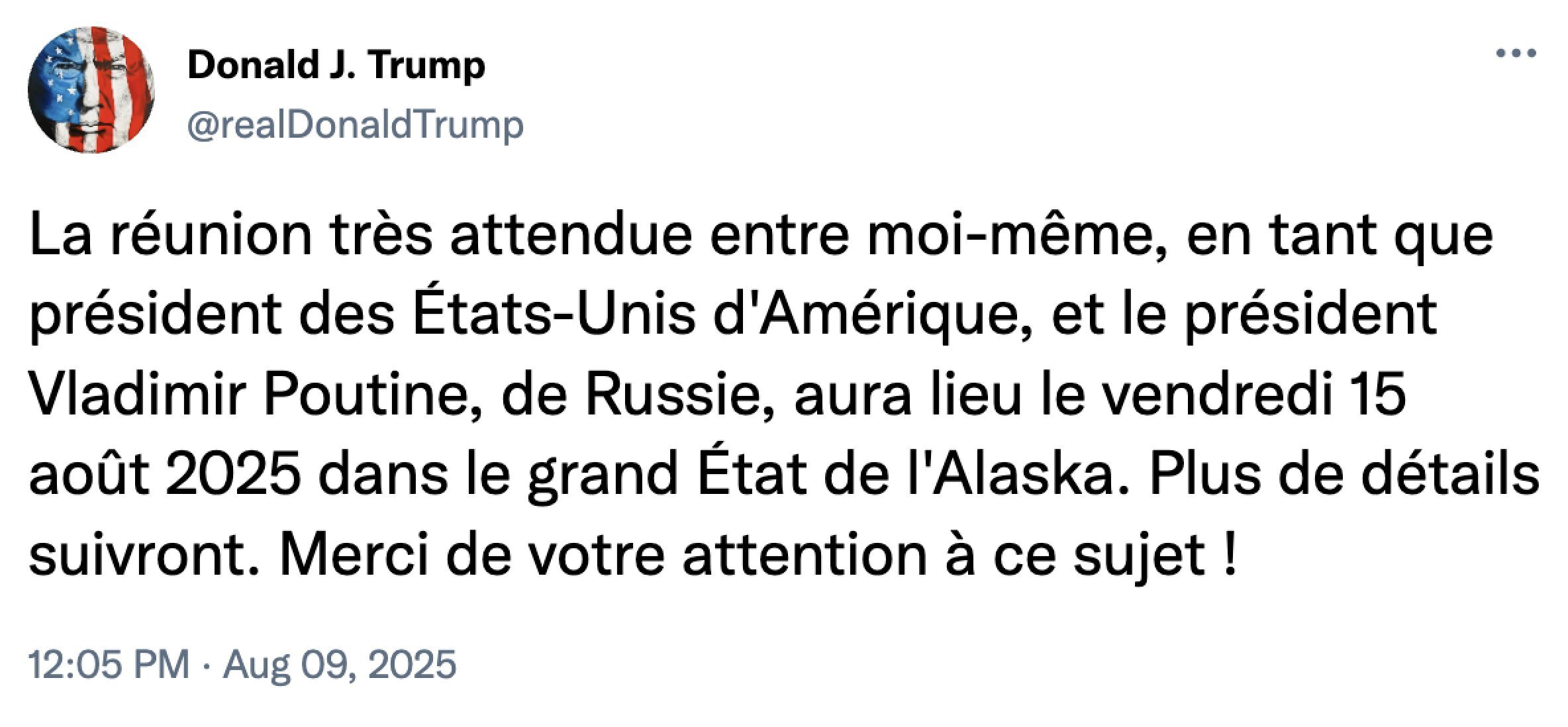 Trump annonce une RENCONTRE avec Vladimir Poutine le 15 août 2025 en Alaska !Source : https://truthsocial.com/@realDonaldTrump/posts/114995403653615328