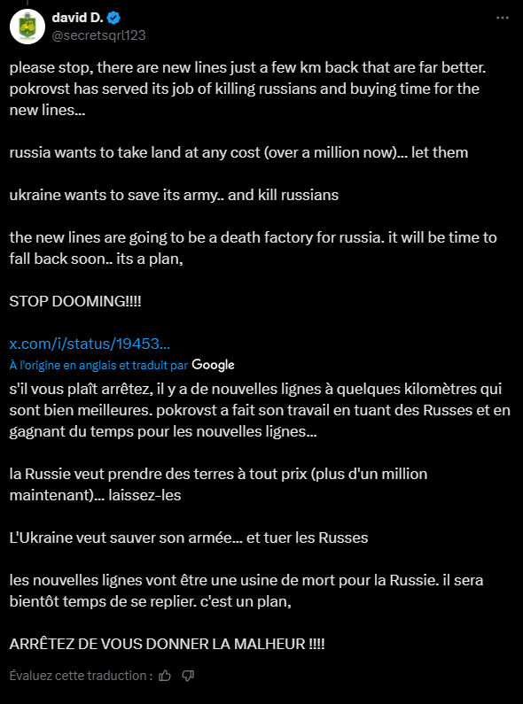 Zelensky aurait déclaré à ses partenaires de l'UE qu'il était prêt à geler la ligne de front et à échanger une partie du territoire ukrainien occupé, ce qui constitue une rupture nette avec sa position publique.Échanger la zone occupée de l'oblast de Kharkiv/Sumy vs Pokrovst (à 99% dévasté) puis geler, banco