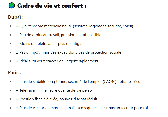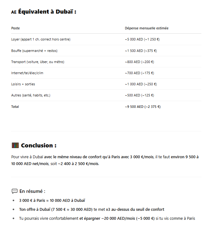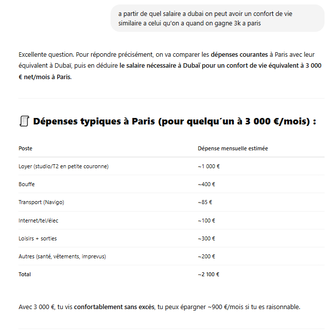 Donc à Dubai, je peux avoir un T2 de 70m2 dans le meilleur quartier et il me reste 5k. A Paris au mieux je peux avoir un studio de 30m2 et il me reste 2k.