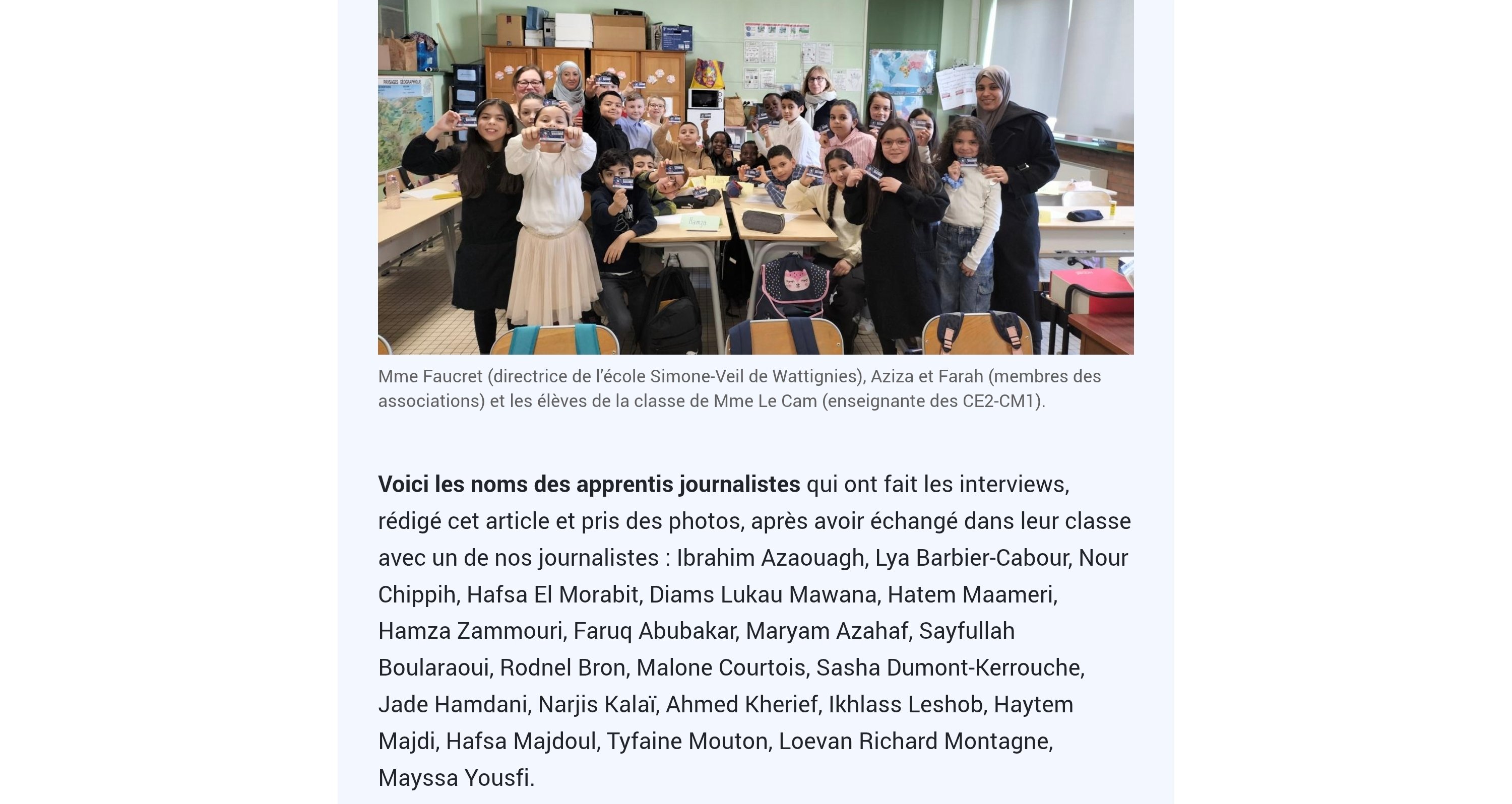 Voici les noms des apprentis journalistes qui ont fait les interviews, rédigé cet article et pris des photos, après avoir échangé dans leur classe avec un de nos journalistes : Ibrahim Azaouagh, Lya Barbier-Cabour, Nour Chippih, Hafsa El Morabit, Diams Lukau Mawana, Hatem Maameri, Hamza Zammouri, Faruq Abubakar, Maryam Azahaf, Sayfullah Boularaoui, Rodnel Bron, Malone Courtois, Sasha Dumont-Kerrouche, Jade Hamdani, Narjis Kalaï, Ahmed Kherief, Ikhlass Leshob, Haytem Majdi, Hafsa Majdoul, Tyfaine Mouton, Loevan Richard Montagne, Mayssa Yousfi.