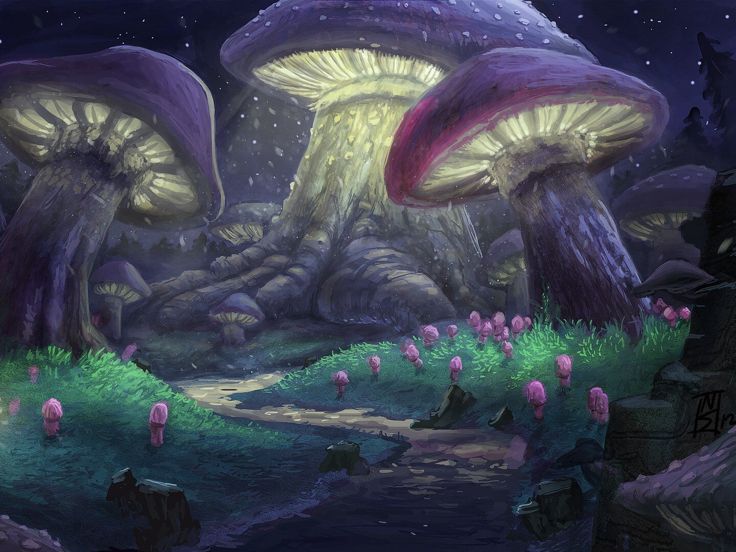 Vous voilĂ dans une de ces forĂȘts de champignons gĂ©ants, aux teintes violacĂ©s. Ils sont en train de gonfler lentement comme des ballons.