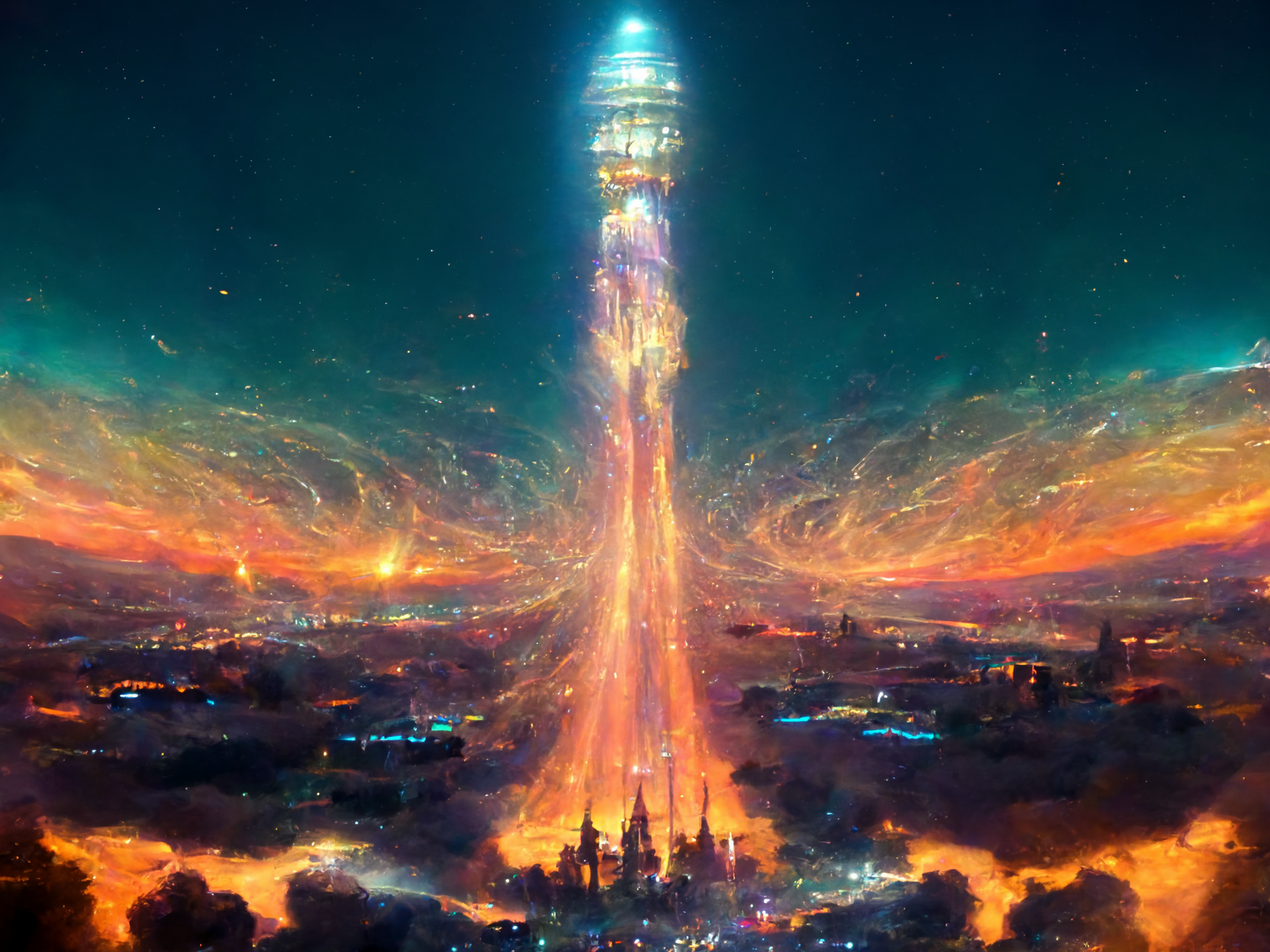 Sur leur route, comme un joyau dans une gangue de tourbe et de bois mort, un geyser de lumière, surgissant de la terre et se diffusant en volutes dans le ciel nocturne.