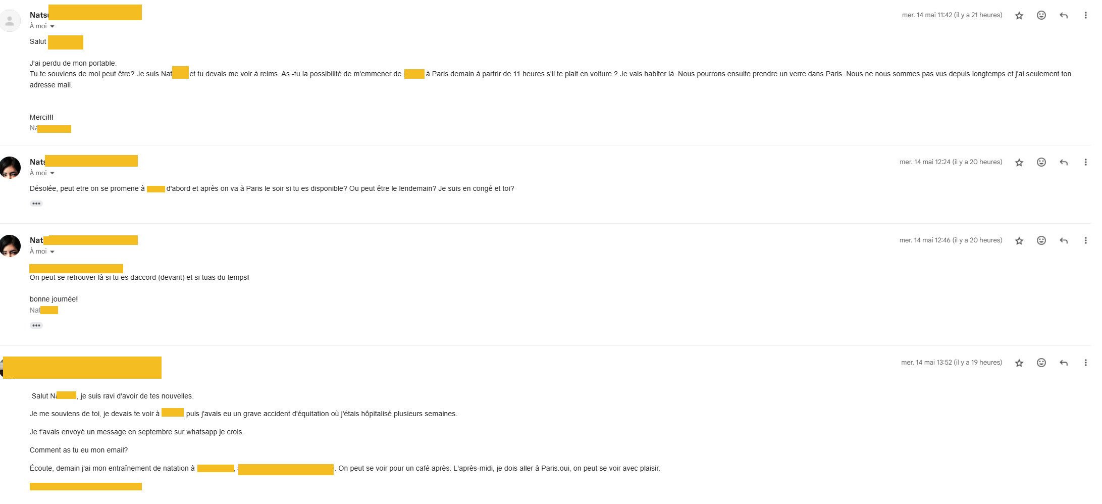 Mais aujourd’hui, elle m’a envoyé un e-mail : elle m’explique qu’elle a perdu son téléphone, qu’elle a retrouvé mon adresse mail que je lui avais donnée à l’époque, et qu’elle aimerait me revoir.