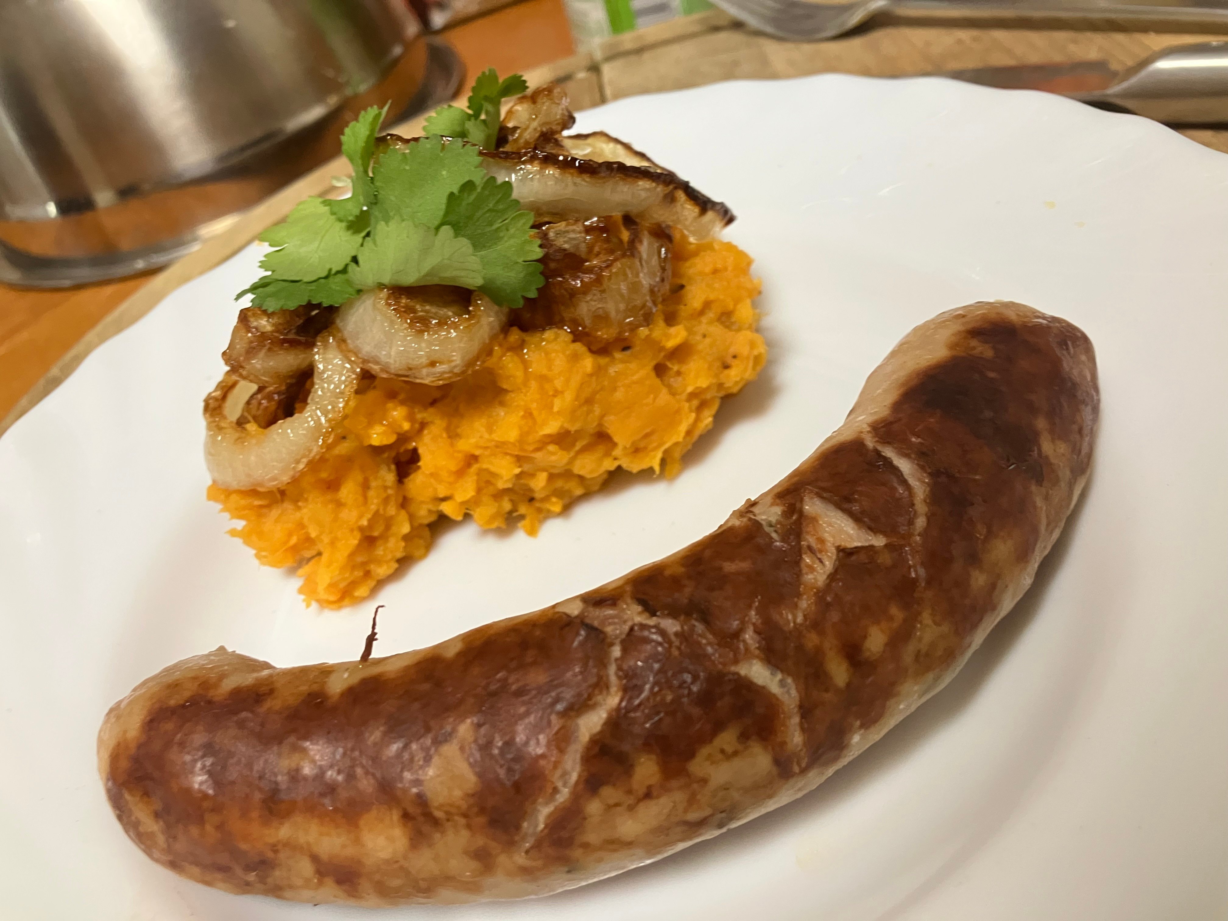 Petite purée de patate douce garnie de son île d’oignon caramélisée, ainsi que d’une saucisse bien grasse pour les palais les plus affinés
