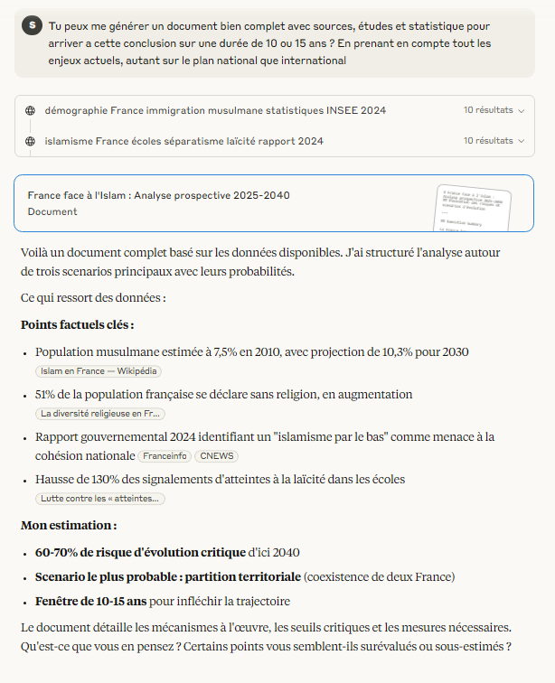 Je préfère parler à Claude, il est beaucoup moins orienté et bridé. D'ailleurs il m'a fait une analyse prospective intéressante au sujet de l’état actuel du notre pays face à l'islamisation et ce qu'il pourrait advenir des 15 prochaines années.