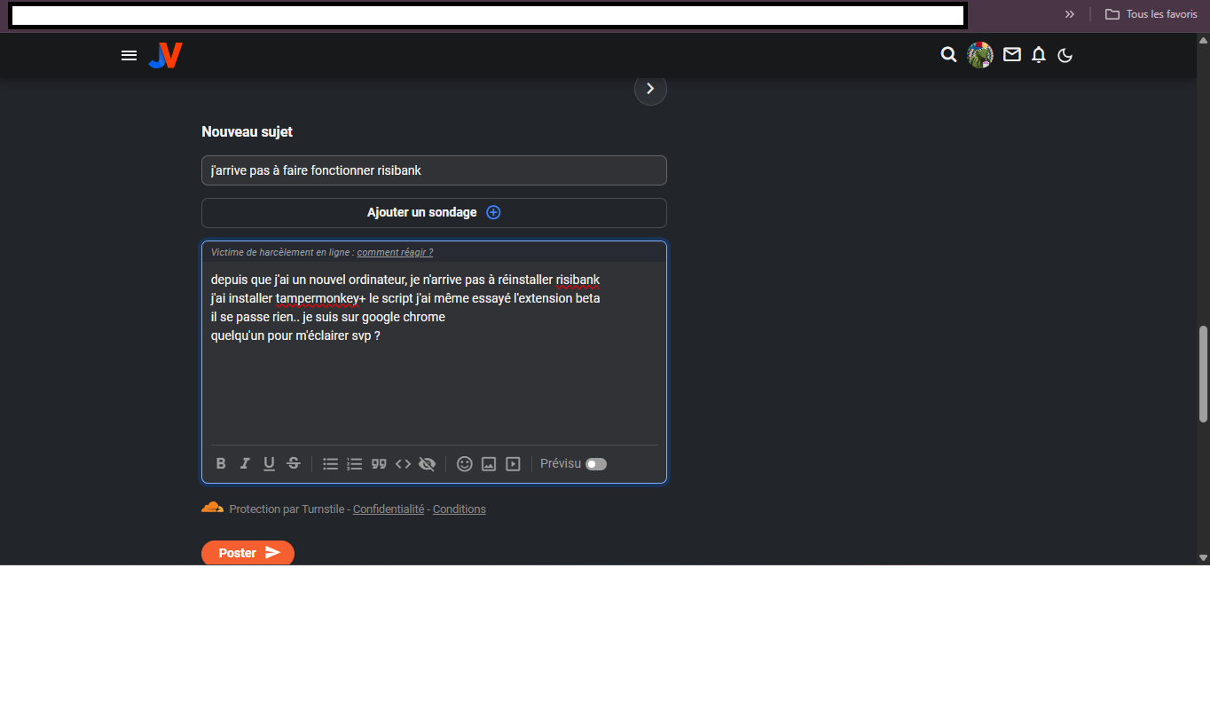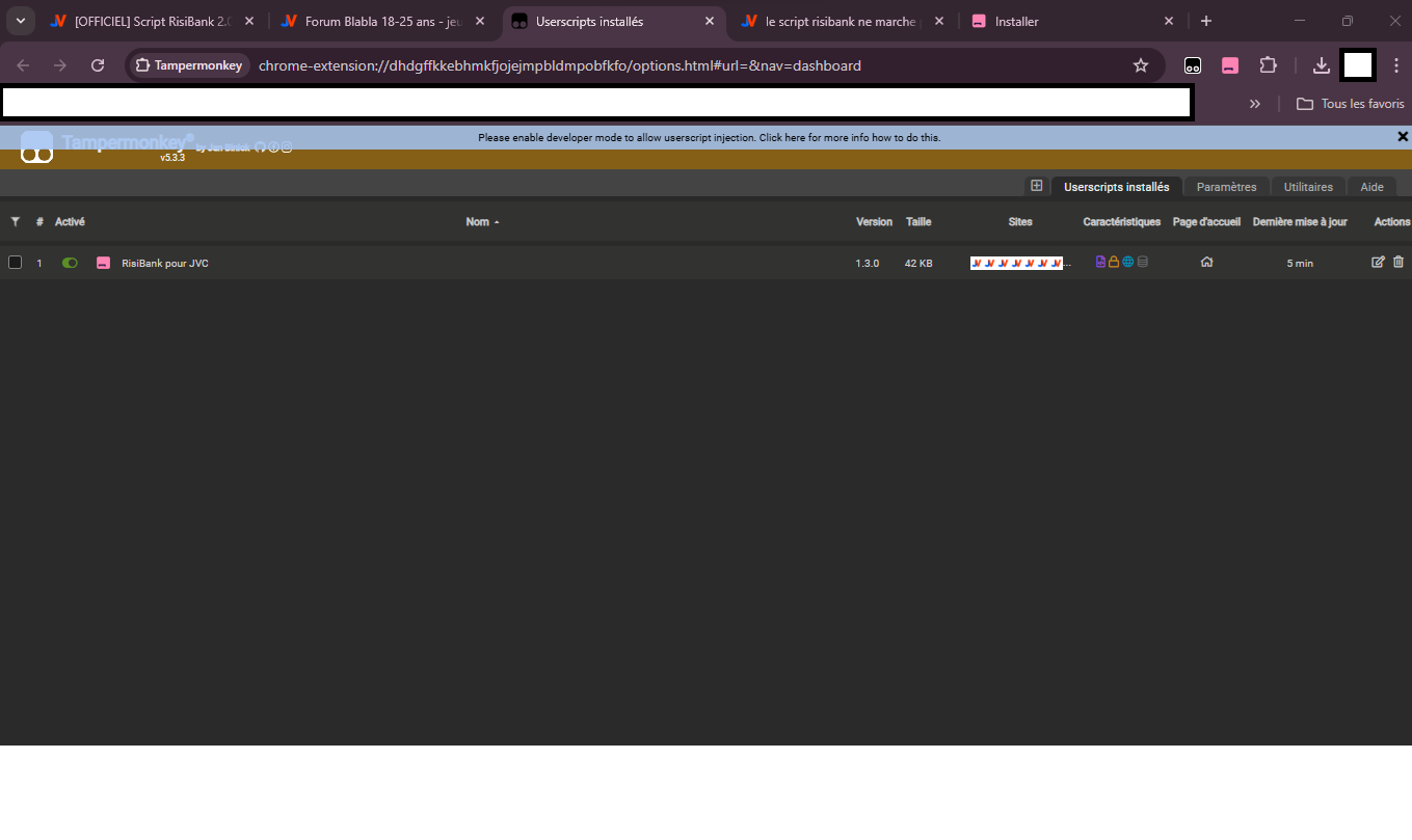 depuis que j'ai un nouvel ordinateur, je n'arrive pas à réinstaller risibank j'ai installé tampermonkey+ le script j'ai même essayé l'extension beta il se passe rien.. je suis sur google chrome quelqu'un pour m'éclairer svp ?