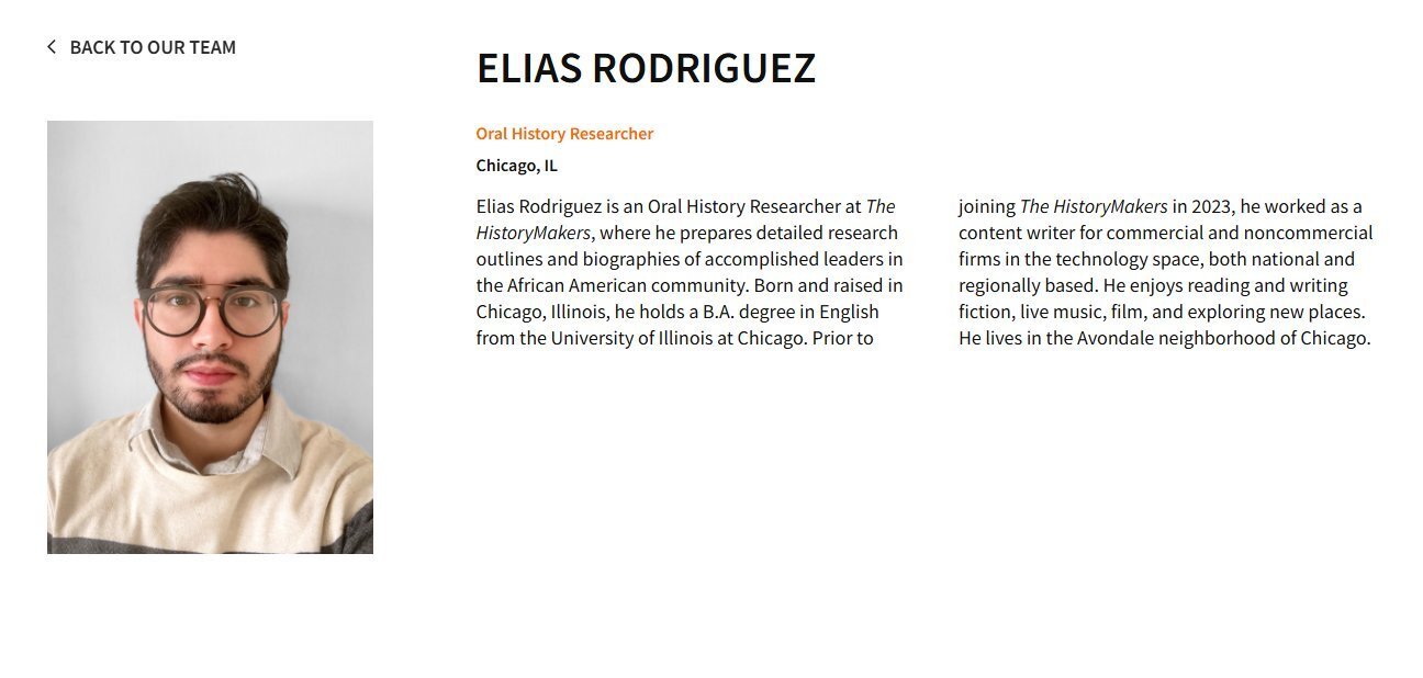 Elias Rodriguez is an Oral History Researcher at The HistoryMakers, where he prepares detailed research outlines and biographies of accomplished leaders in the African American community. Born and raised in Chicago, Illinois, he holds a B.A. degree in English from the University of Illinois at Chicago. Prior to joining The HistoryMakers in 2023, he worked as a content writer for commercial and noncommercial firms in the technology space, both national and regionally based. He enjoys reading and writing fiction, live music, film, and exploring new places. He lives in the Avondale neighborhood of Chicago.