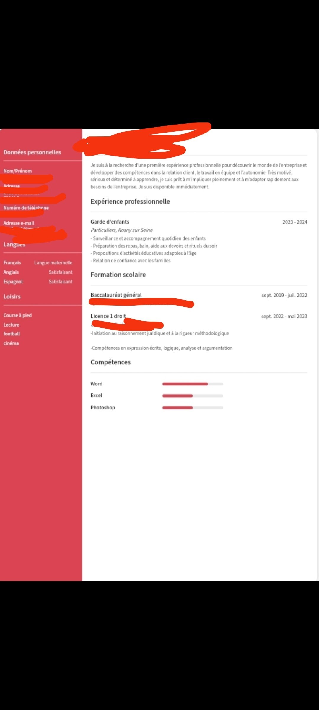 Refais le CV deja, utilise Canva ou un truc template propre (exit le rouge) et les barres de compétences c'est non