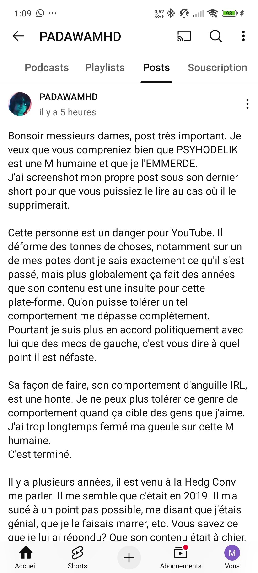 Je viens 2 secondes sur son live et j'entends : "Je ban tous les racistes qui soutiennent Psyhodelik dans le chat"Mais quel immense golem celui-là