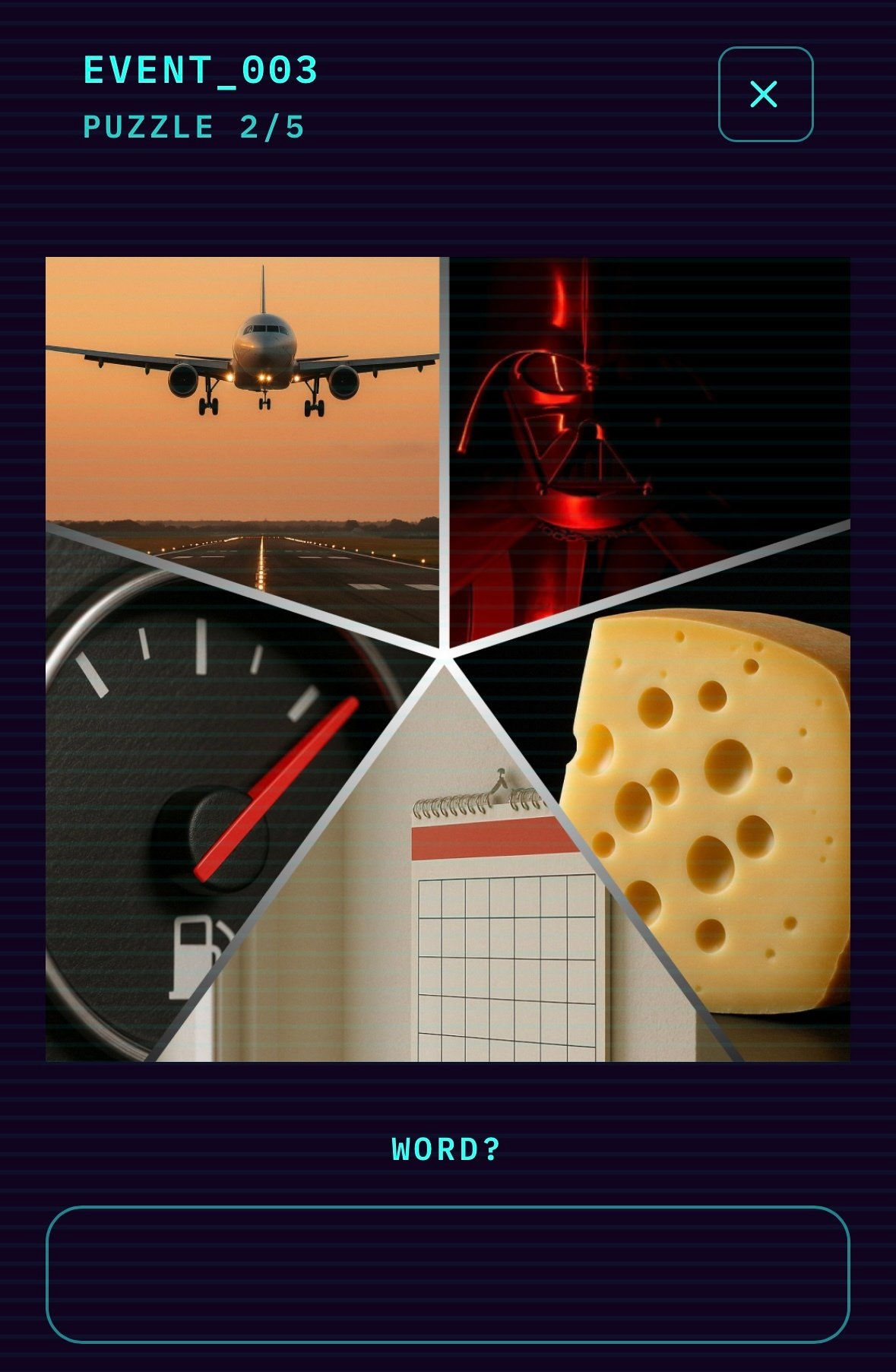Empty pour la jauge qui peut être vide, les trous dans le gruyère, ce sont des trous donc vides, le calendrier n’a aucune note dedans donc il est vide, il y a des trous et pas de date indiquée, l’avion et Dark Vador je n’ai pas d’explications, même si le réservoir de l’avion peut être vide et Dark Vador est vide d’émotions c’est très tiré par les cheveux et ce n’était évidemment pas la bonne réponse.