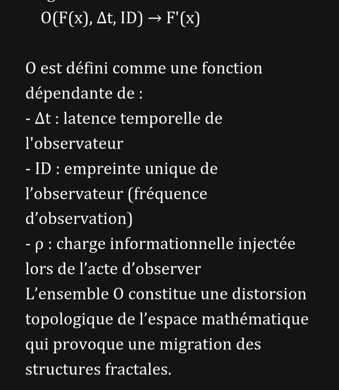 Soit F(x) une fractale stable (ex. Mandelbrot), et F'(x) une fractale voisine géométriquement mais distincte structurellement. Nous postulons qu’un opérateur d’observation O agit comme une force de glissement :