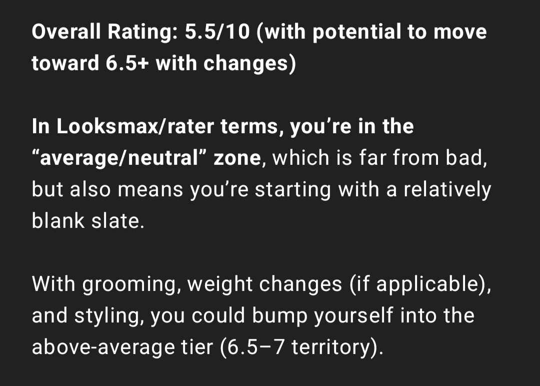 "Rate me with brutal honesty and objectivity like they’d do on looksmax.org or r/truerateme. I can handle the honesty and furthermore I need it to improve myself. Rate me from 1 to 10. A 1/10 is someone with a deformity or birth defect - a 5/10 is Jesse Eisenberg or Andy Samberg - a 10/10 is Matt Bomer or Henry Cavill "