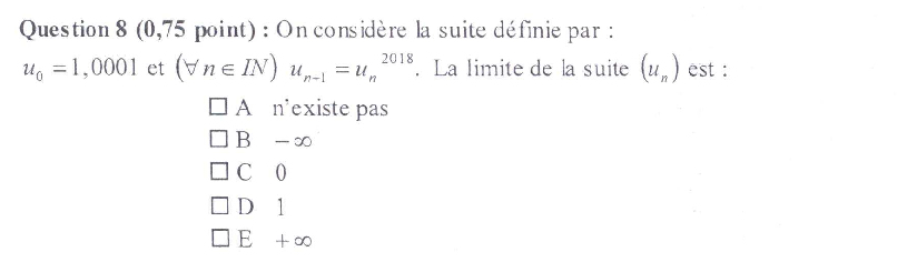 en tous cas ca se joue entre D et E pour les deuxpour la proba aucune idee mais la limite + l'infinie me semble etre la plus correcte je vois pas comment une limite de suite sur N peut donner moins l'infinie y'a aucune raison pour que ça donne 1 ça se joue entre 0 et l'infinie