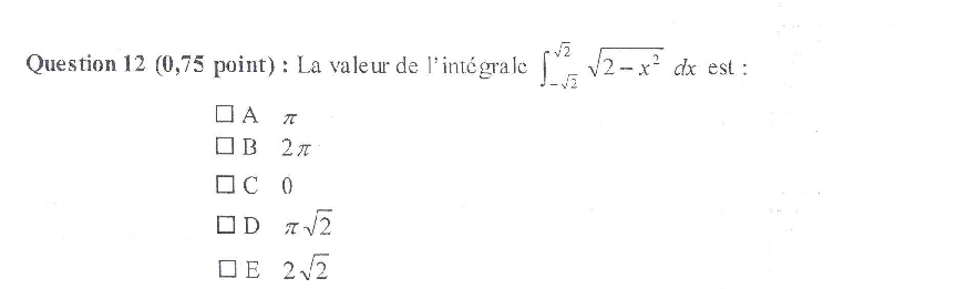 Pour l'intégral, c'est pas la plus simple, faut calculer la primitive, c'est celle bizarre avec arctan, et à la fin on a pi https://www.wolframalpha.com/input?i=integral+sqrt%282-x%5E2%29