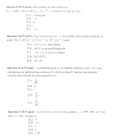 en tous cas ca se joue entre D et E pour les deuxpour la proba aucune idee mais la limite + l'infinie me semble etre la plus correcte je vois pas comment une limite de suite sur N peut donner moins l'infinie y'a aucune raison pour que ça donne 1 ça se joue entre 0 et l'infinie