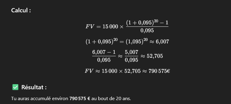 Tu mets 15000€ par an sur des ETF world et S&P500 (moyenne entre 8.5 et 10% de rendement par an), pendant 20 ans :![]()