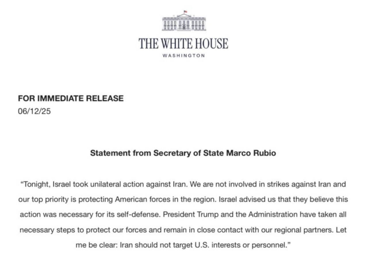 JUST IN - U.S. not involved in strikes against Iran: Rubio