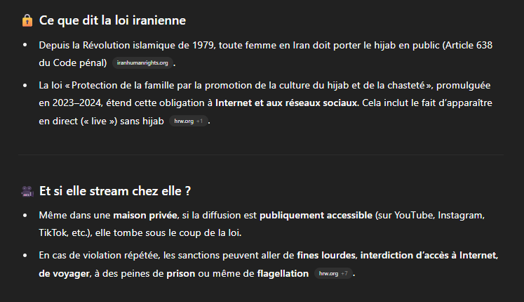 une streameuse etait a cote de la bombe https://www.twitch.tv/videos/2484269301?t=3h56m39sPutain mais éduquez vous sur l'Iran et sa culture, vous êtes incultes et éduqués par la propagande. La Perse a une culture millénaire, ils ont des fondamentalistes musulmans au pouvoir depuis 79 mais la population civile a toute une culture et une histoire qui la rend bien moins perméable aux injonctions religieuses que le sont les populations arabes.