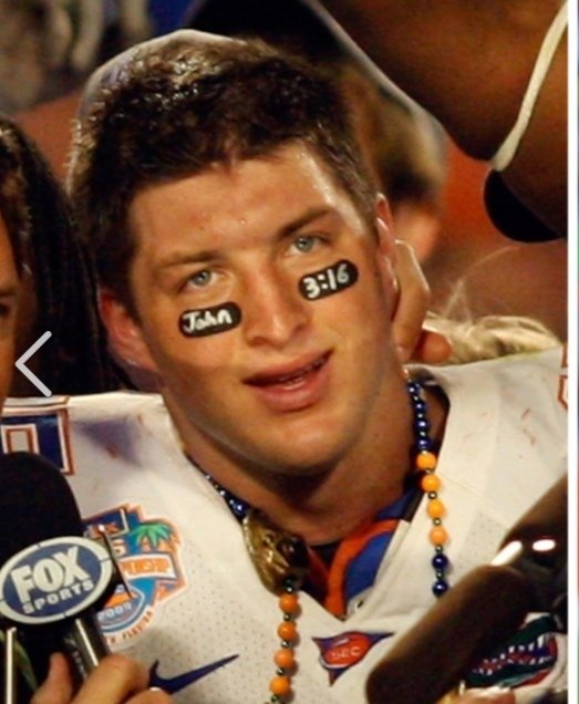 L'histoire se passe en 2009, Tim Tebow, un joueur de football américain écrit sous ses yeux un des plus importants et plus connu verset de la bible (Jean 3:16) comme le montre cette photo :