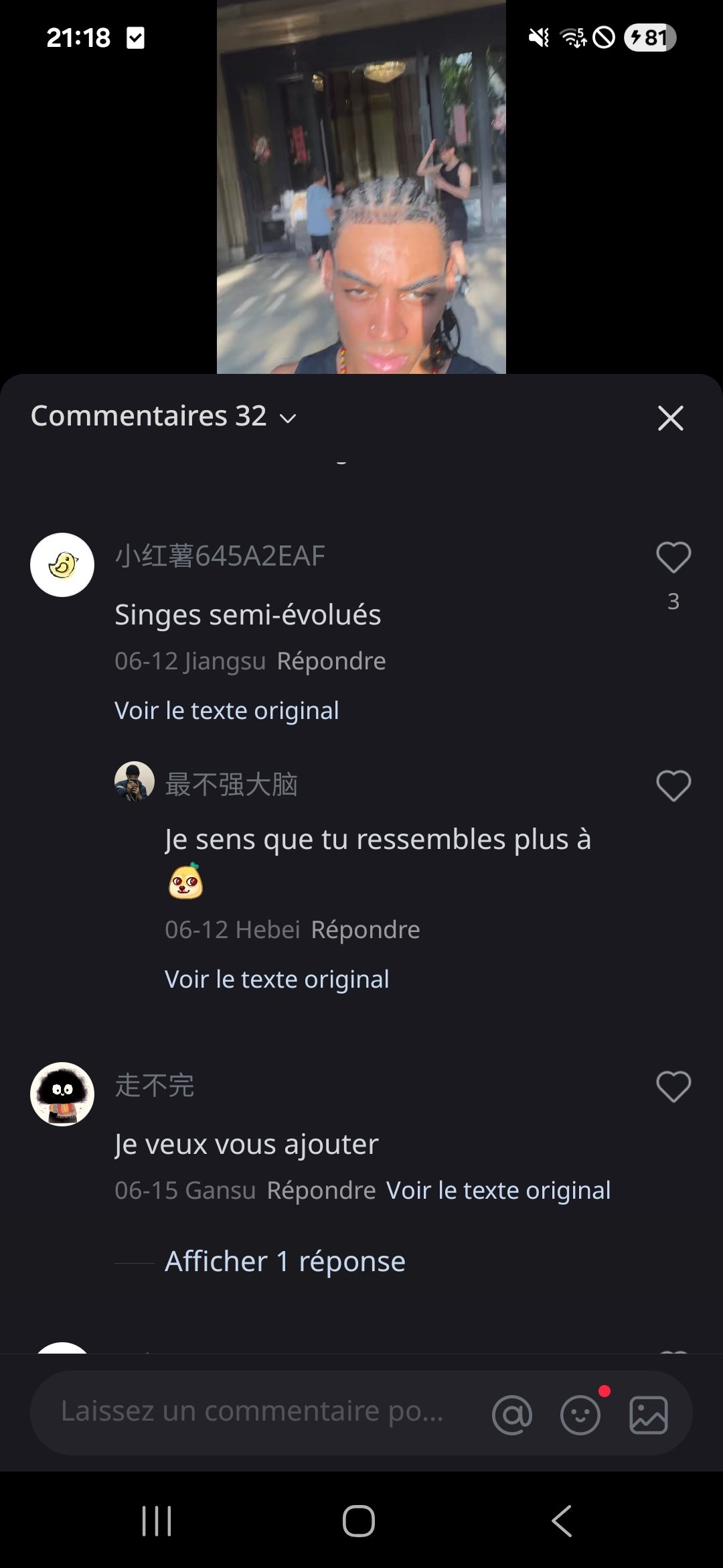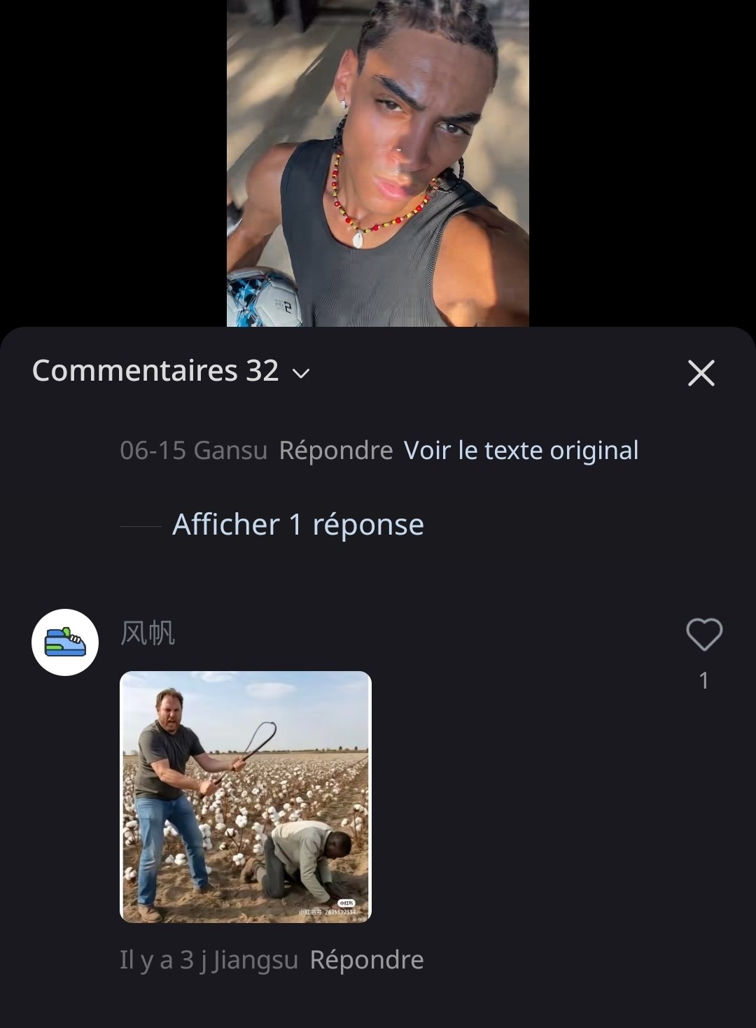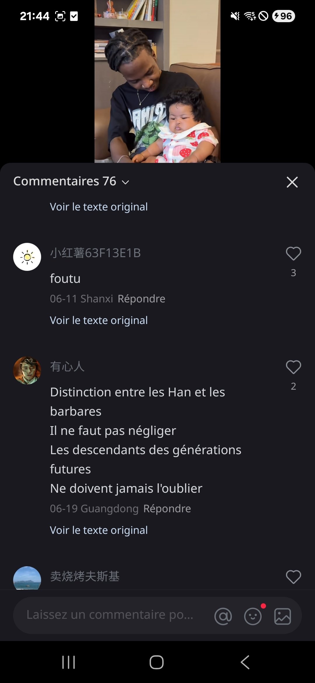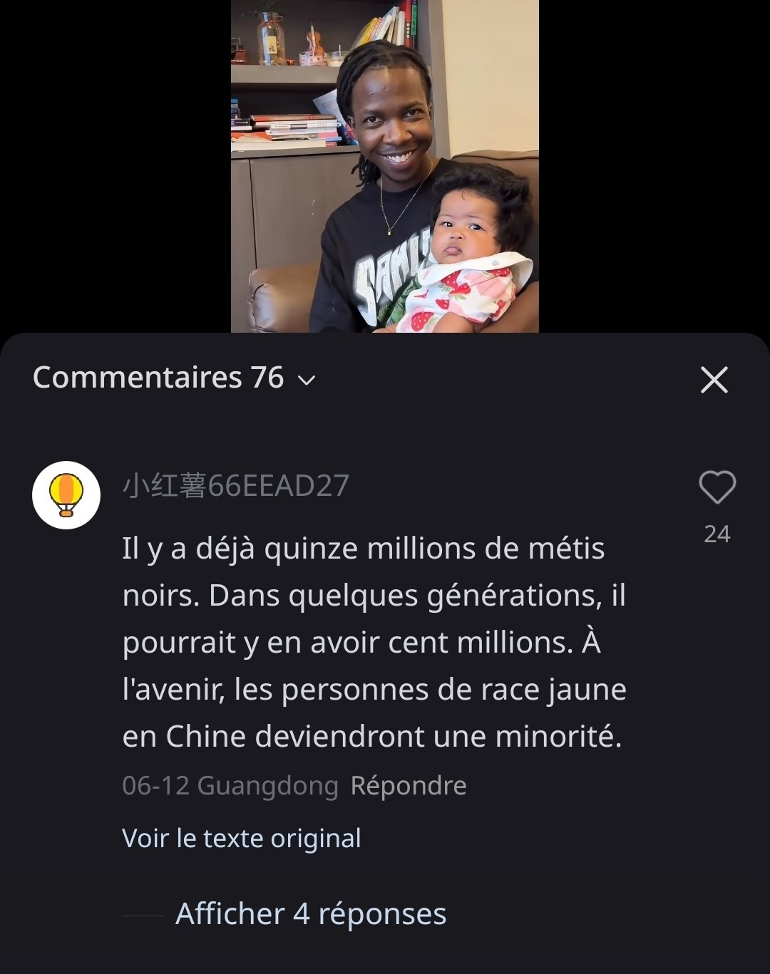 J'ai téléchargé une appli de réseau social chinoise (Xiaohongshu), et parfois je tombe sur des photos/vidéos d'Africains en Chine, et dans les commentaires, c'est la foire Quelques exemples :