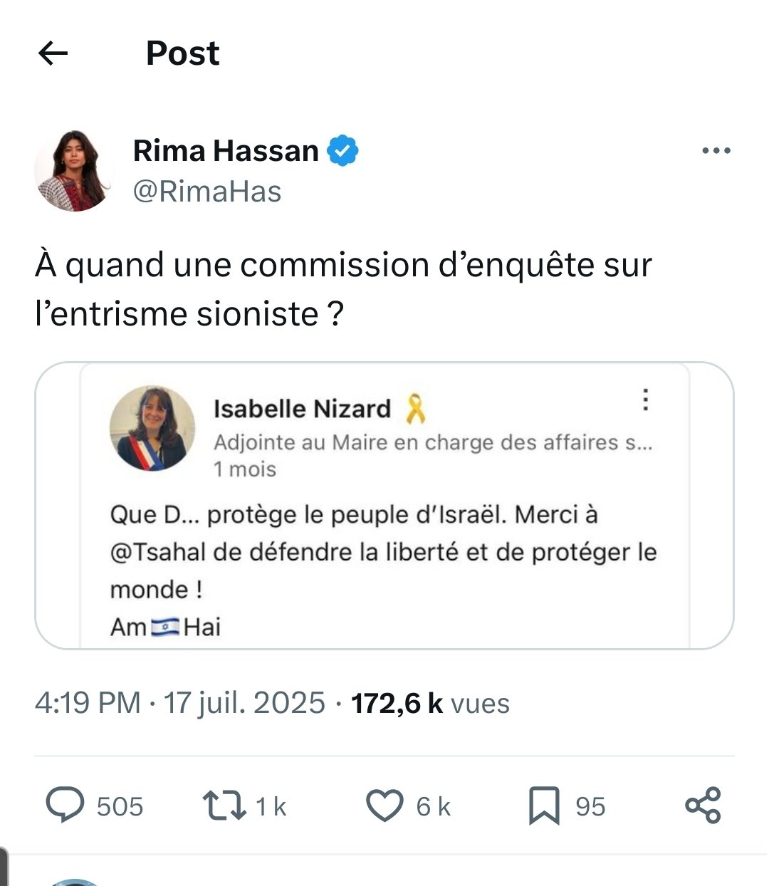 Le 18 juillet 2025 Ă 09:28:42 :Elle a totalement raison pour le coup aller voir les post de cette adjointe au maire c'est plus une politicienne de la knesset que de la France