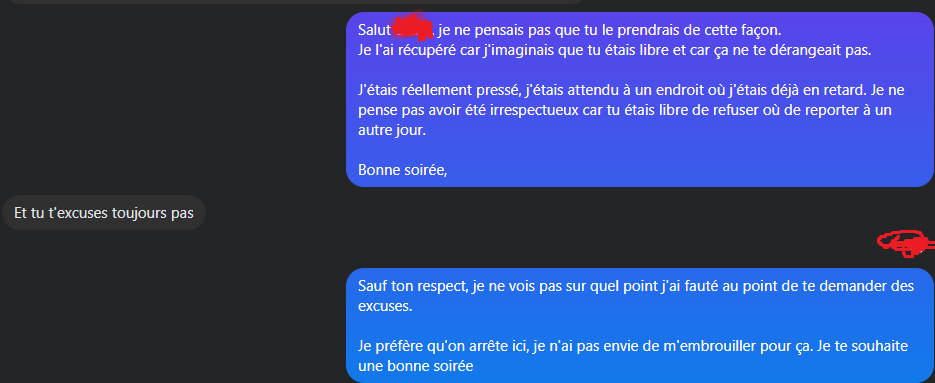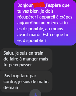 Sauf qu'au moment où j'arrive, elle me donne mon appareil à crêpe et elle commence à me parler de tout et de rien (j'ai rien écouté de ce qu'elle m'a dit car j'étais très pressé, puis je sortais de ma nuit de travail donc j'étais hs) et je pars en plein milieu en lui disant "Désolé je suis pressé, A + !", je l'entends au loin dire "Ah t'es sérieux, bah aurevoir...".