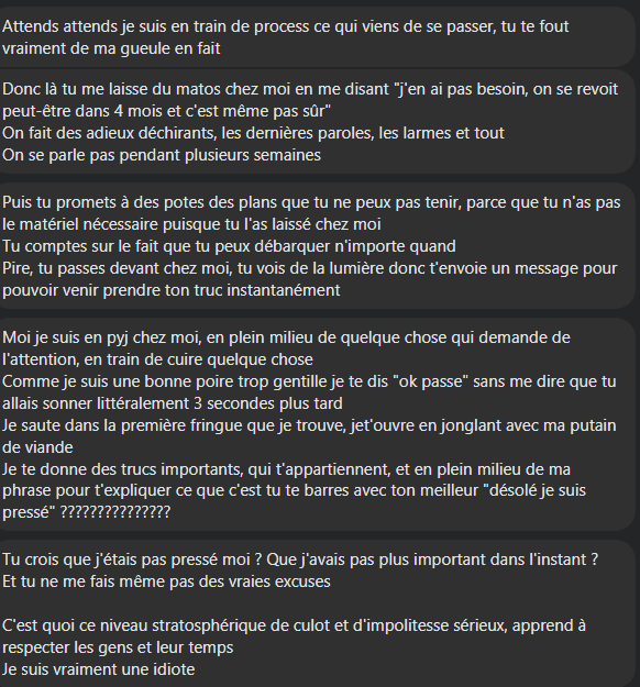 C'est quoi le problème des femmes ? Elle a décidé de me quitter, je me détache quasiment d'elle (J'ai tellement glow-up en 2 mois que je suis en abondance de femelle, on oublie plus facilement dans les bras d'une autre comme on dit), et elle rage car elle s'attendait à ce que je lui parle de la pluie et du beau temps ?