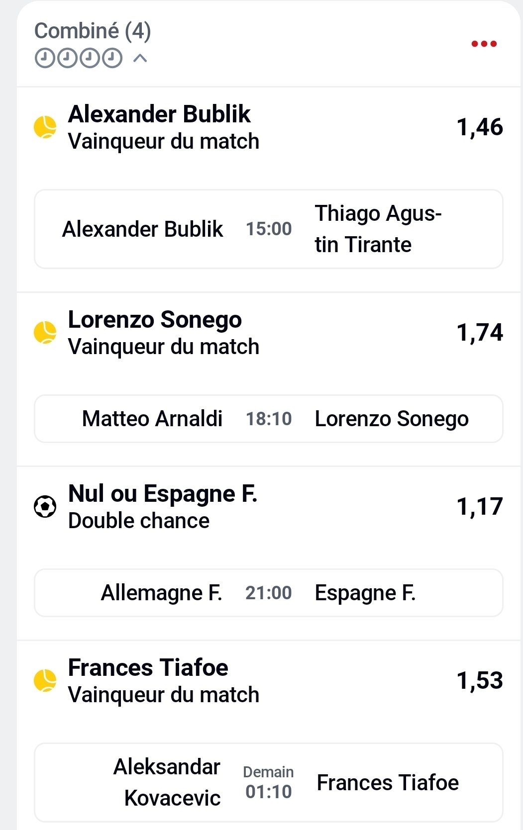 1.17 c'est pas un 1.10 et je voulais sécurisé les 45e de gagné pour compléter ma misedonc c’est l’équivalent d’avoir fait un pari simple de 38,50€ sur nul ou espagne