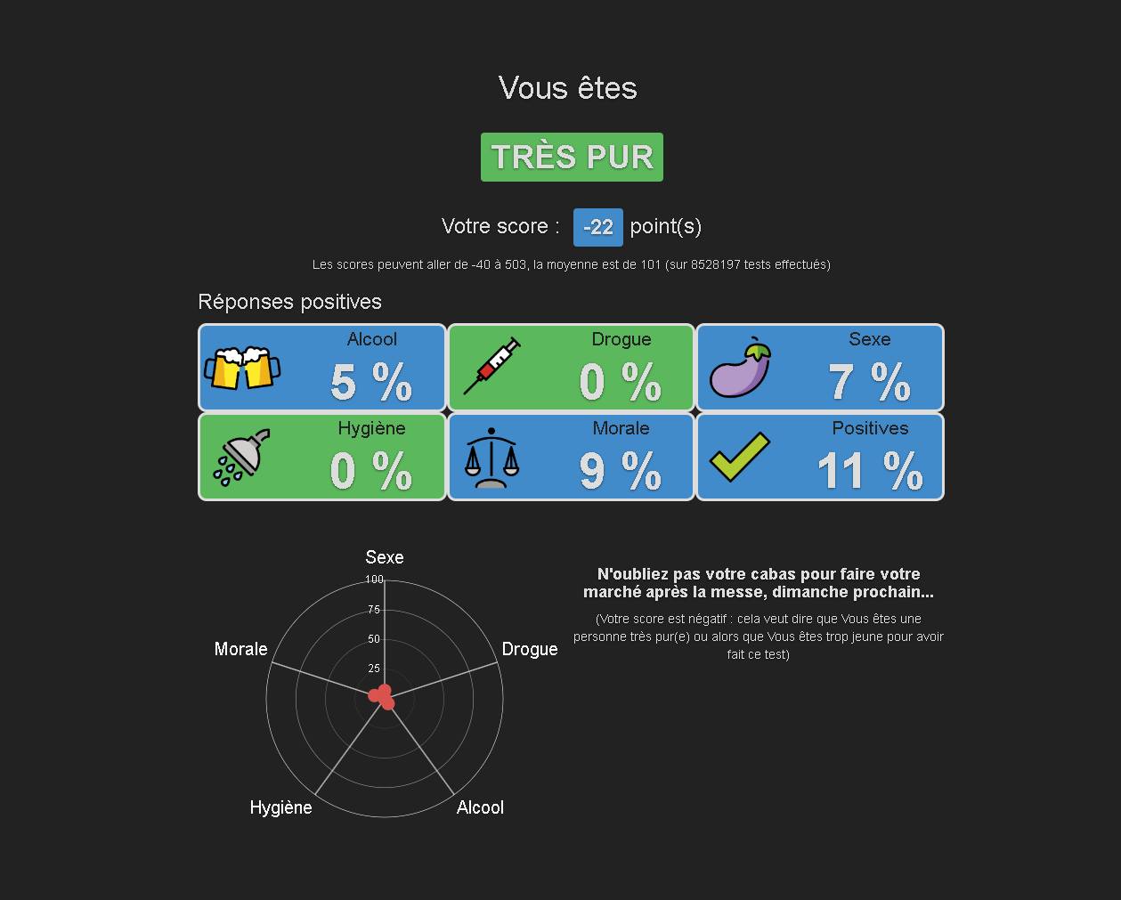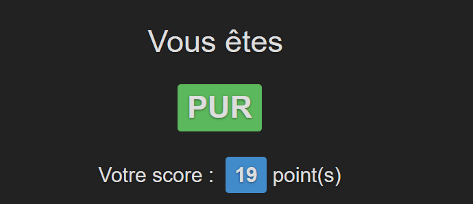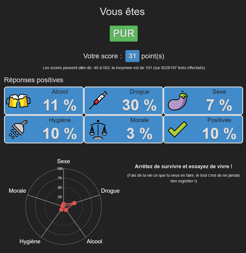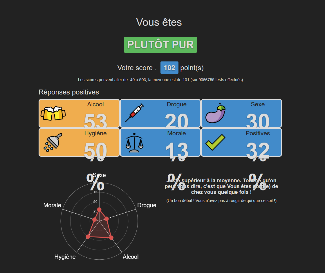 (Votre score est négatif : cela veut dire que Vous êtes une personne très pur(e) ou alors que Vous êtes trop jeune pour avoir fait ce test)