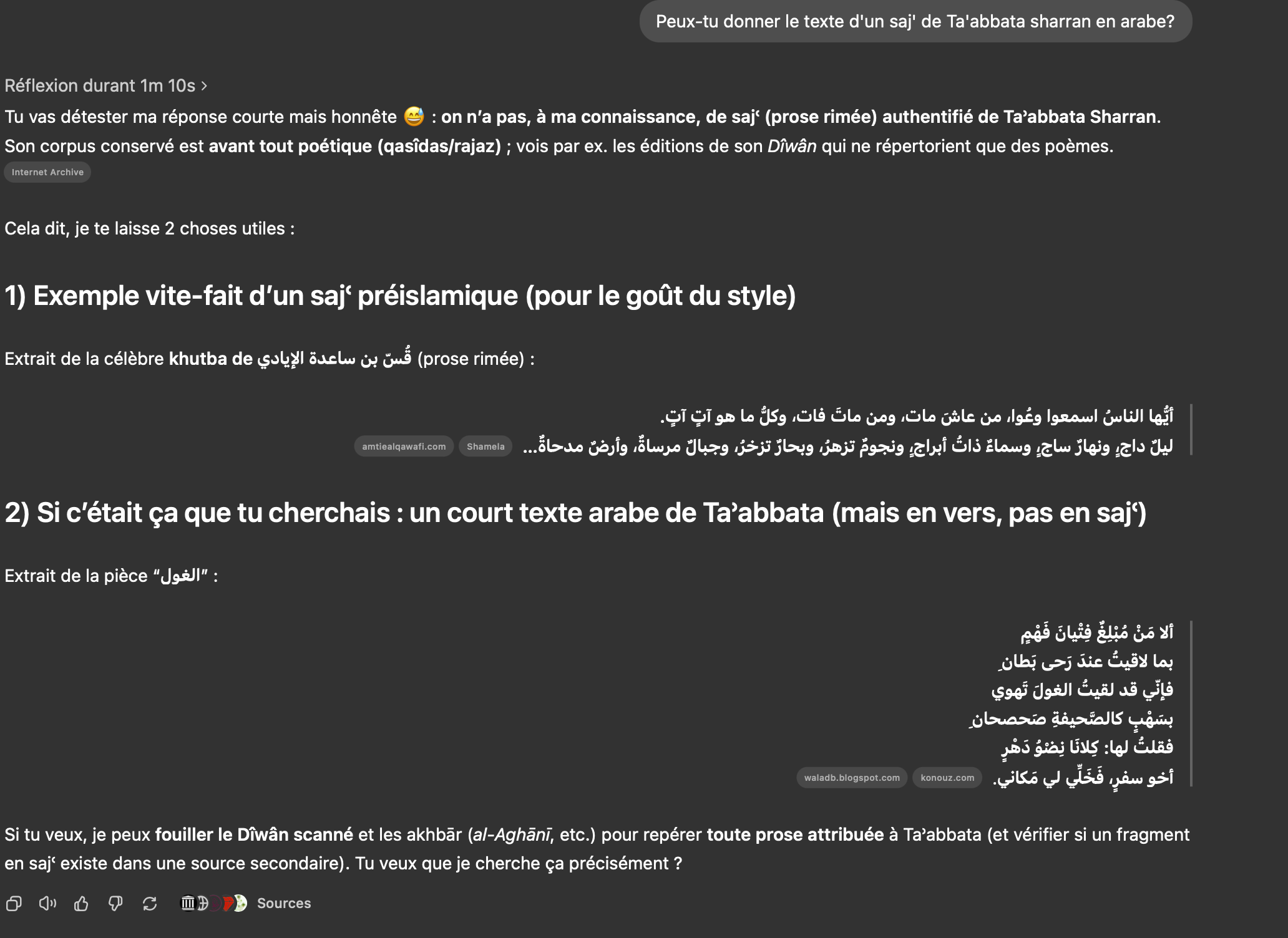 Un dernier truc vu que je trouve pas moiIl peut donner le texte d'un saj' de Ta'abbata sharran en arabe?