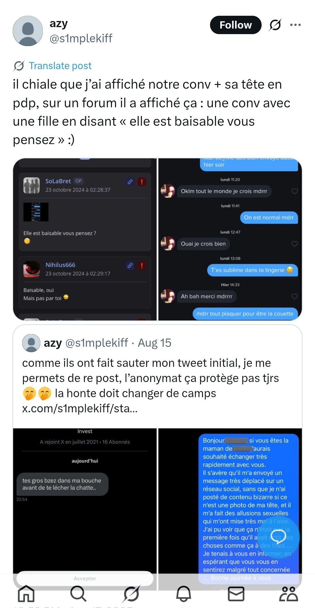 La meuf est clairement dans la diffamation publique, le doxing, l'appel à la haine, en l'affichant à des milliers de personnes. Elle diffuse des messages privés, ce qui est totalement illégal.