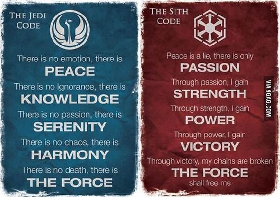 Le code Jedi c'est la négation de l'humanité, le code Sith représente l'acceptation de cette dernière et invite à la transcendance de celle-ci. Le choix est vite fait