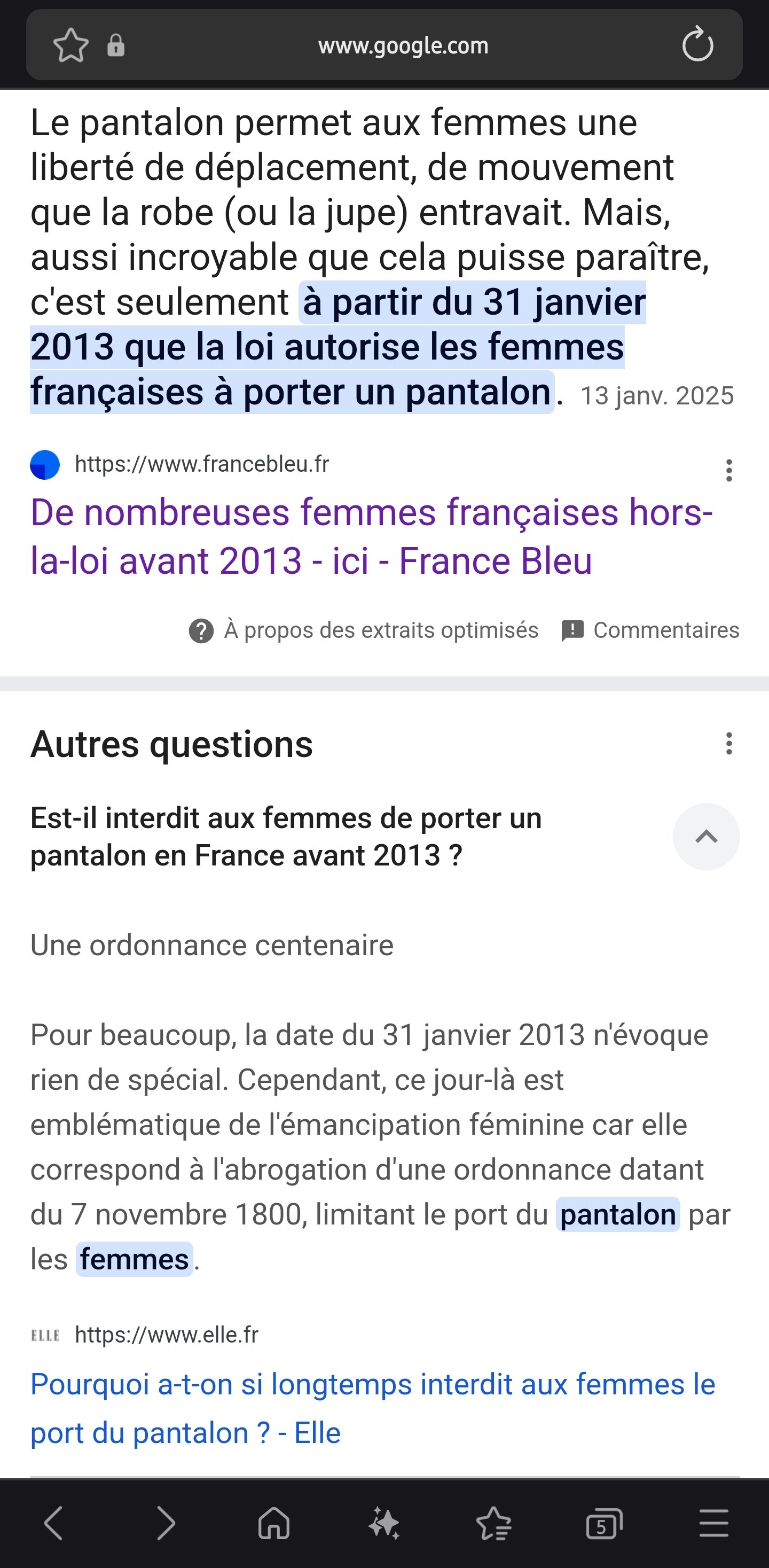 > > > Tu peux verifier, jusqu'en 2013 il etait interdit pour une femme de porter un pantalon en France