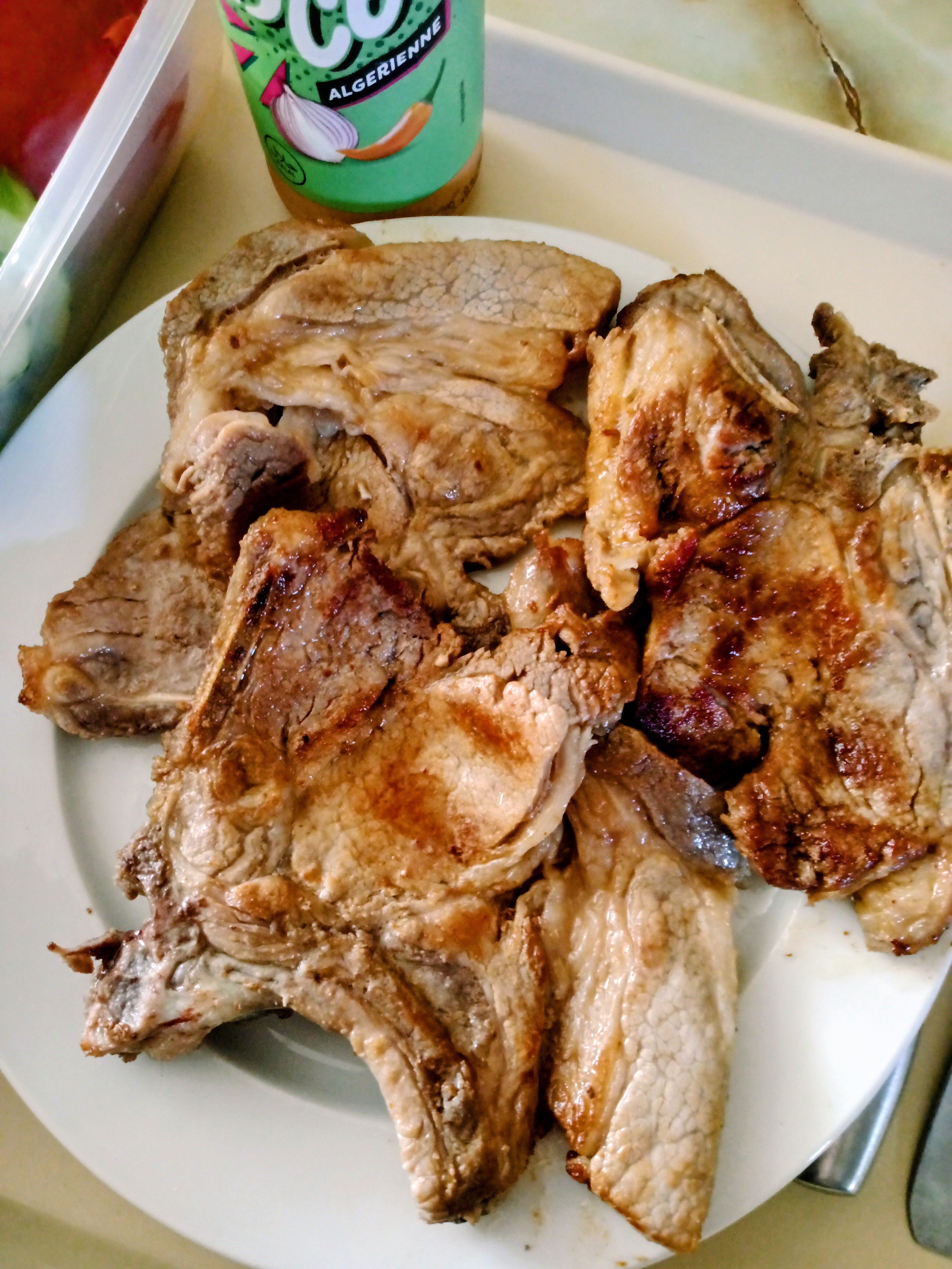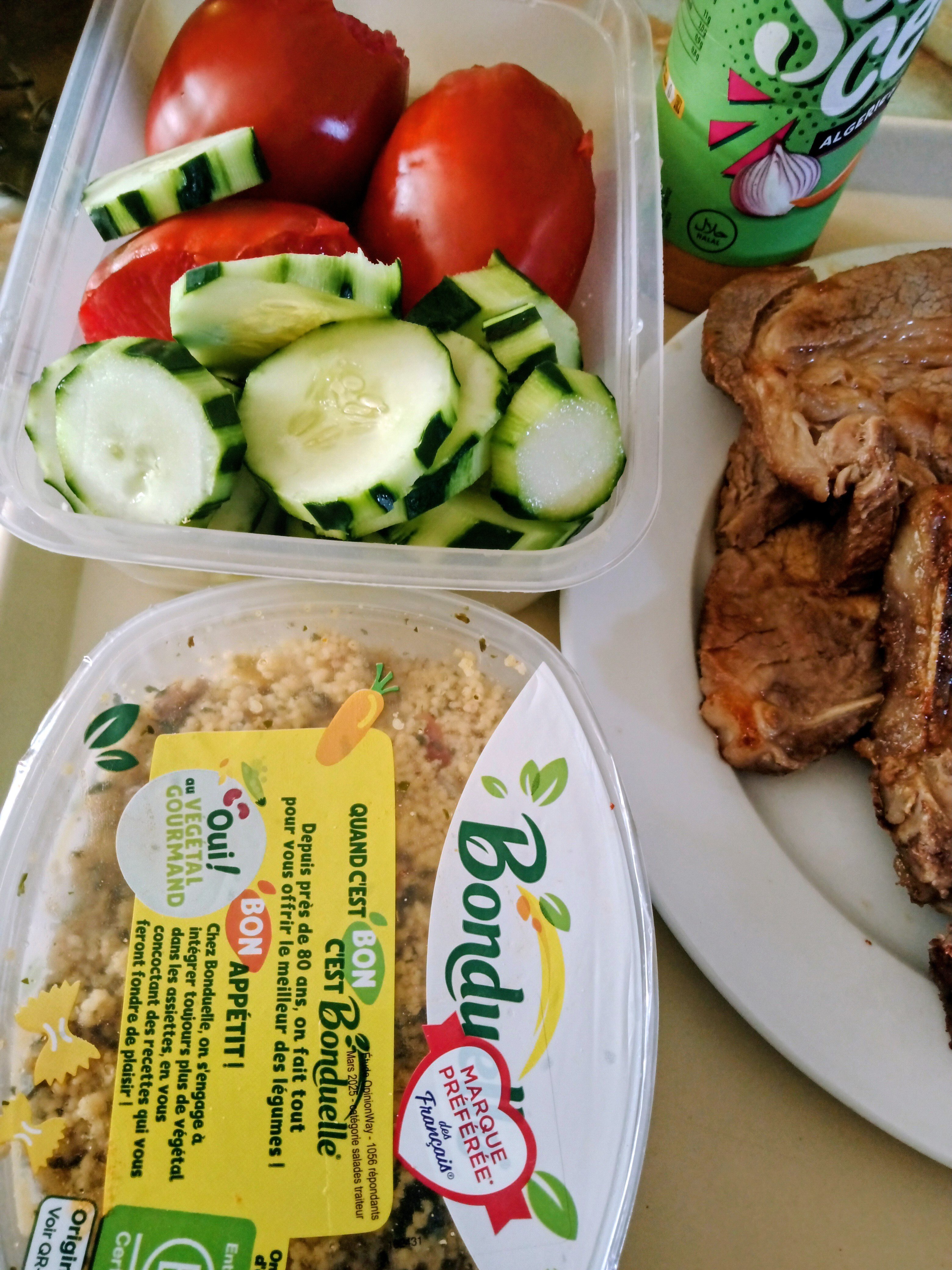 Le 10 août 2025 à 11:21:05 : Taboulé Trois cotes de porc Trois grosses tomates du jardin Un concombre du jardin Sauce algérienne Infusion glacée d'Artemisia