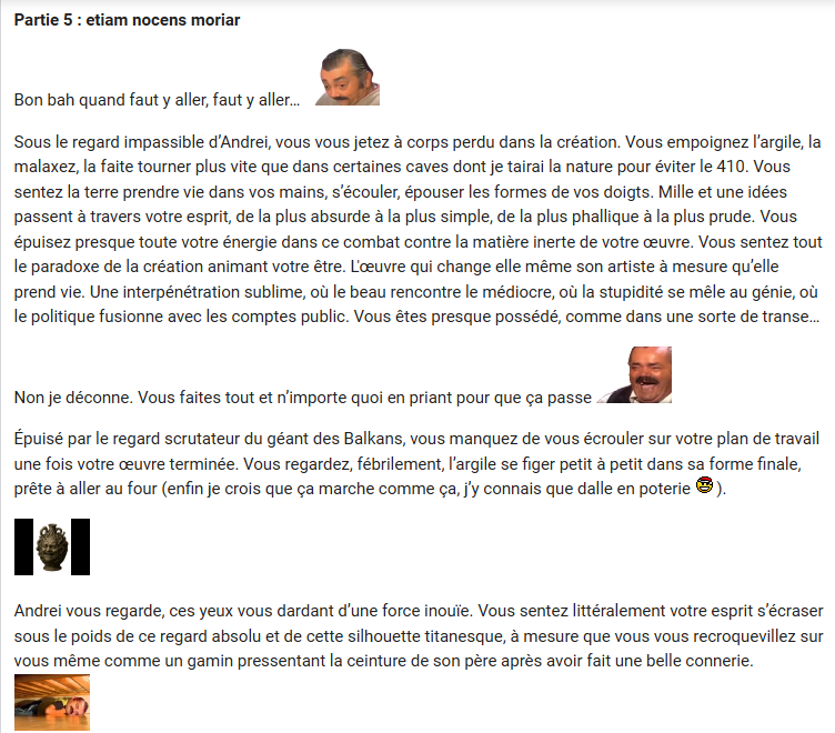 Sous le regard impassible d’Andrei, vous vous jetez à corps perdu dans la création. Vous empoignez l’argile, la malaxez, la faite tourner plus vite que dans certaines caves dont je tairai la nature pour éviter le 410. Vous sentez la terre prendre vie dans vos mains, s’écouler, épouser les formes de vos doigts. Mille et une idées passent à travers votre esprit, de la plus absurde à la plus simple, de la plus phallique à la plus prude. Vous épuisez presque toute votre énergie dans ce combat contre la matière inerte de votre œuvre. Vous sentez tout le paradoxe de la création animant votre être. L'œuvre qui change elle même son artiste à mesure qu’elle prend vie. Une interpénétration sublime, où le beau rencontre le médiocre, où la stupidité se mêle au génie, où le politique fusionne avec les comptes public. Vous êtes presque possédé, comme dans une sorte de transe…